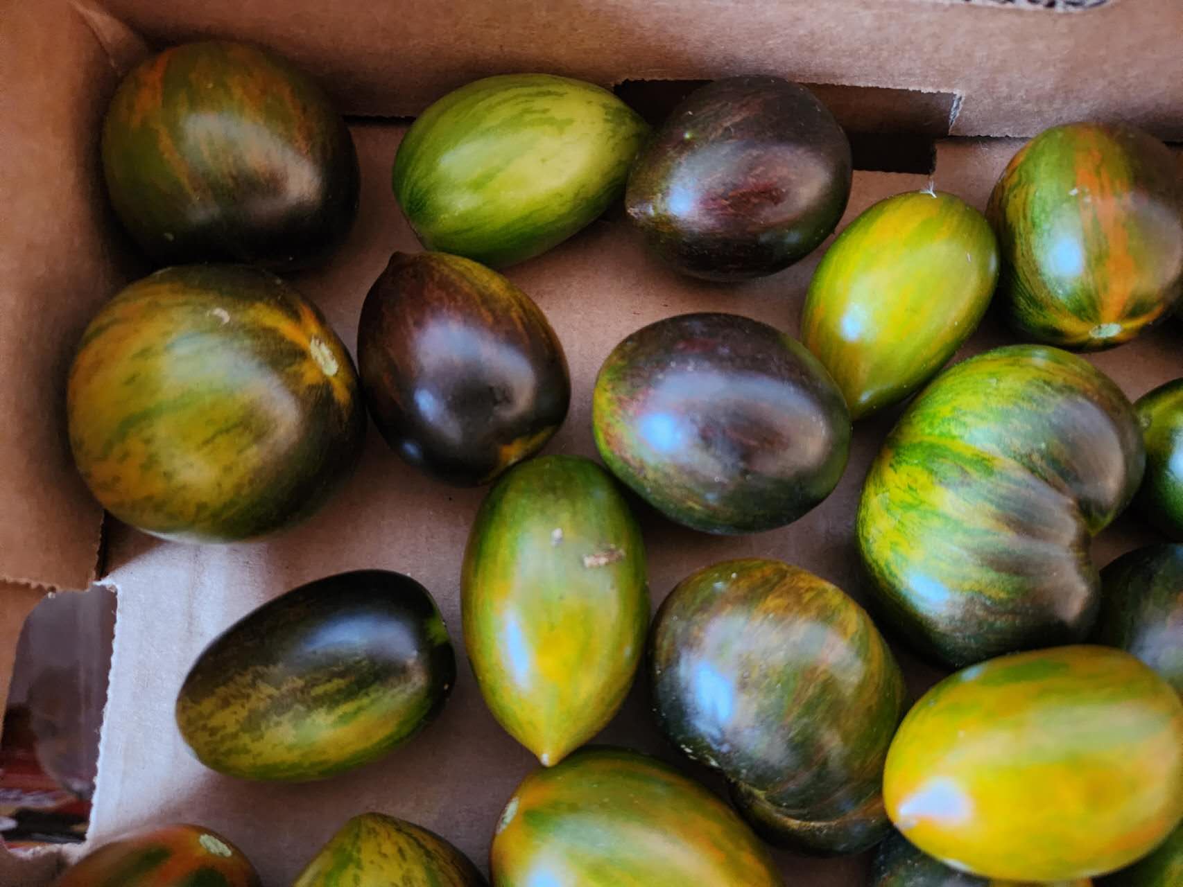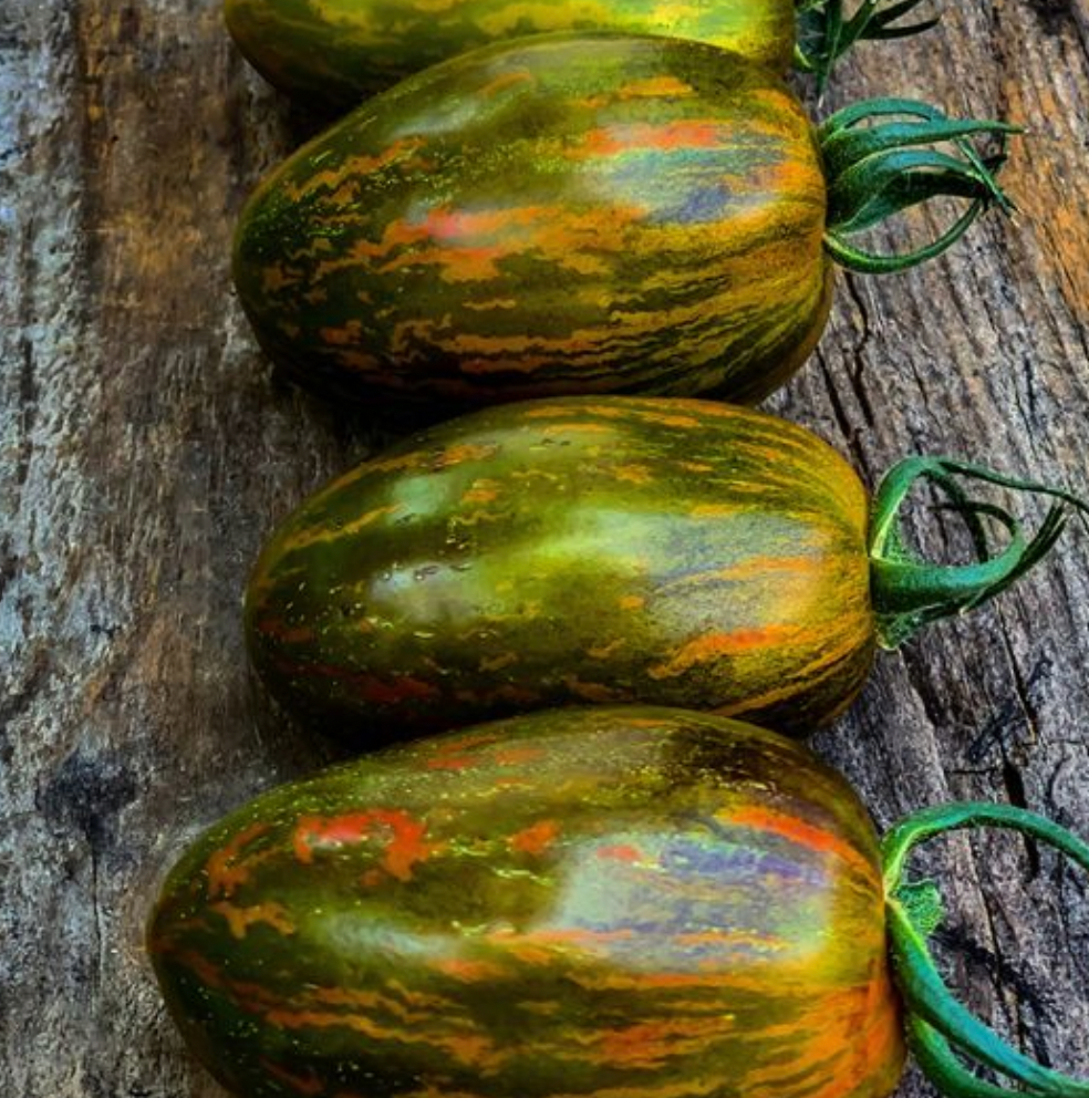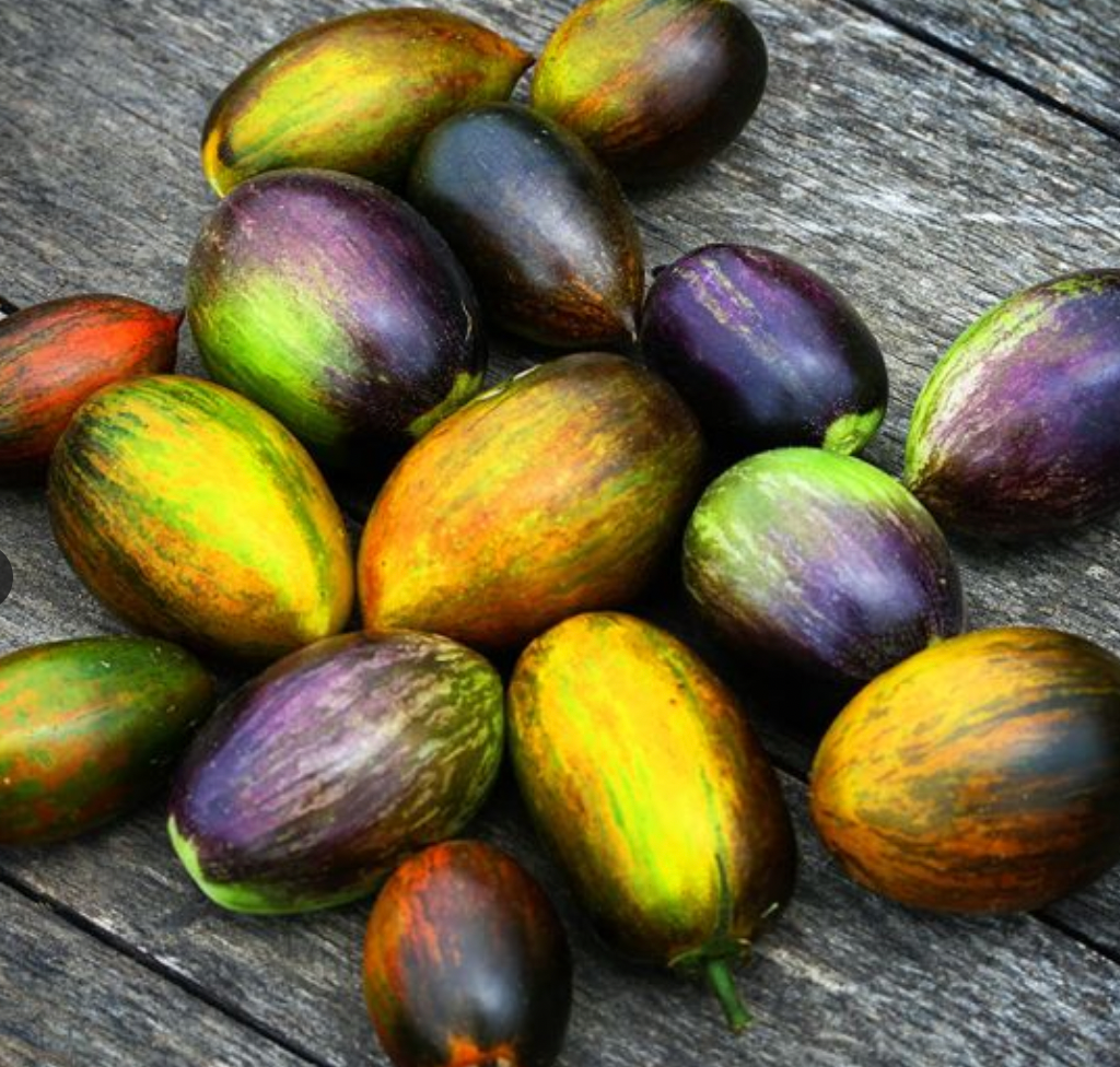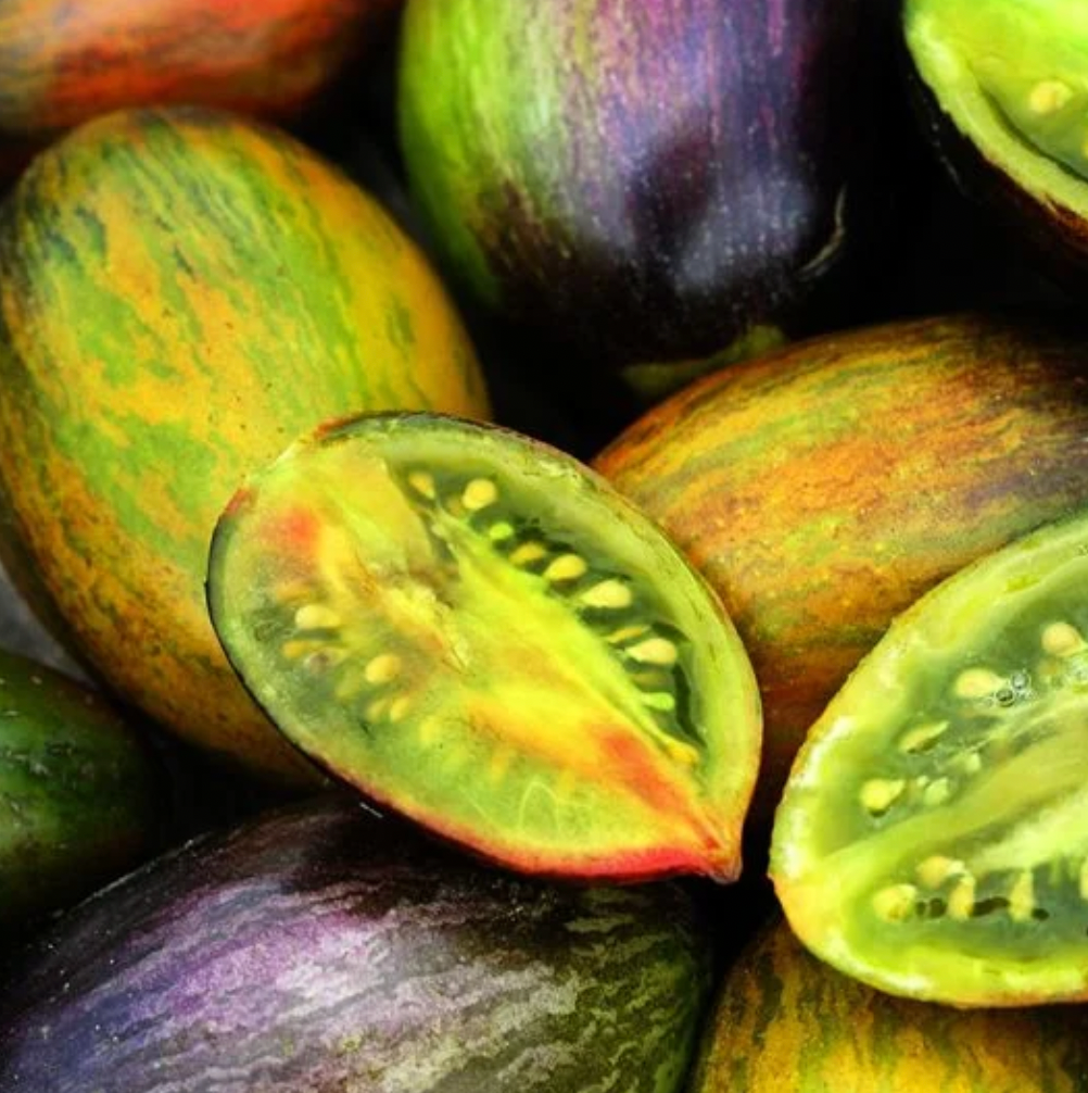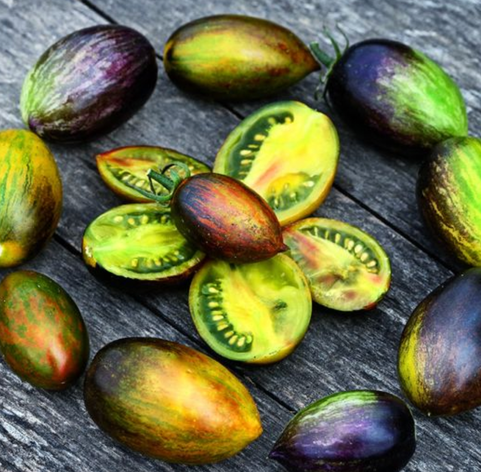 Our favorite tomato! Large, elongated cherries in clusters. The color (and flavor!) is a full-blown assault on the senses—lavender and purple stripes that turn to Technicolor olive-green, red, and brown/blue stripes when fully ripe. Really wild! Fruit holds well on the vine or off, making this amazing variety a good candidate for market growers. Crack-resistant fruit is extraordinarily sweet! Wispy foliage looks delicate but belies these plants’ rugged constitution and high productivity. These range some in size from a large grape to plum-sized.